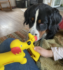 Betty mit Quietschi - und rechts mit Mama auf dem Sofa
